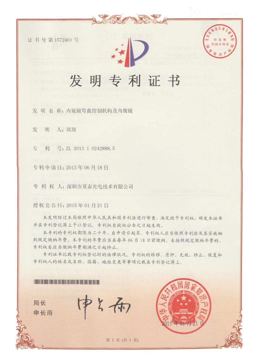 亞泰光電首頁  >>  走進亞泰  >>  亞泰光電資質榮譽  >>   發明專利  >>  內窺鏡彎曲控制機構及內窺鏡