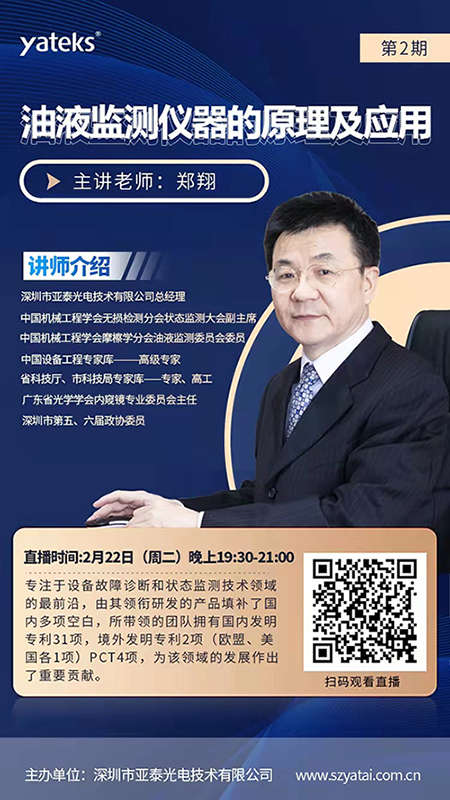 深圳市亞泰光電技術有限公司在2022年2月22日,農歷正月二十二星期二,一個非常值得被記住的日子里開啟了油液監測技術的第二輪直播分享。本輪直播主題- 油液監測儀器的原理及應用。此次直播,請到了深圳亞泰光電總經理鄭翔老師,鄭翔老師是油液監測行業的專家,大咖級人物,他目前是: